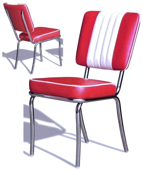 Chaise style Diner américain vintage, piètement en métal chromé et siège et dossier en skaï uni avec passe-poil blanc. Elle n'est pas seulement belle, elle est aussi très confortable avec une assise en mousse épaisse et ferme. Elle est disponible en 7 couleurs.